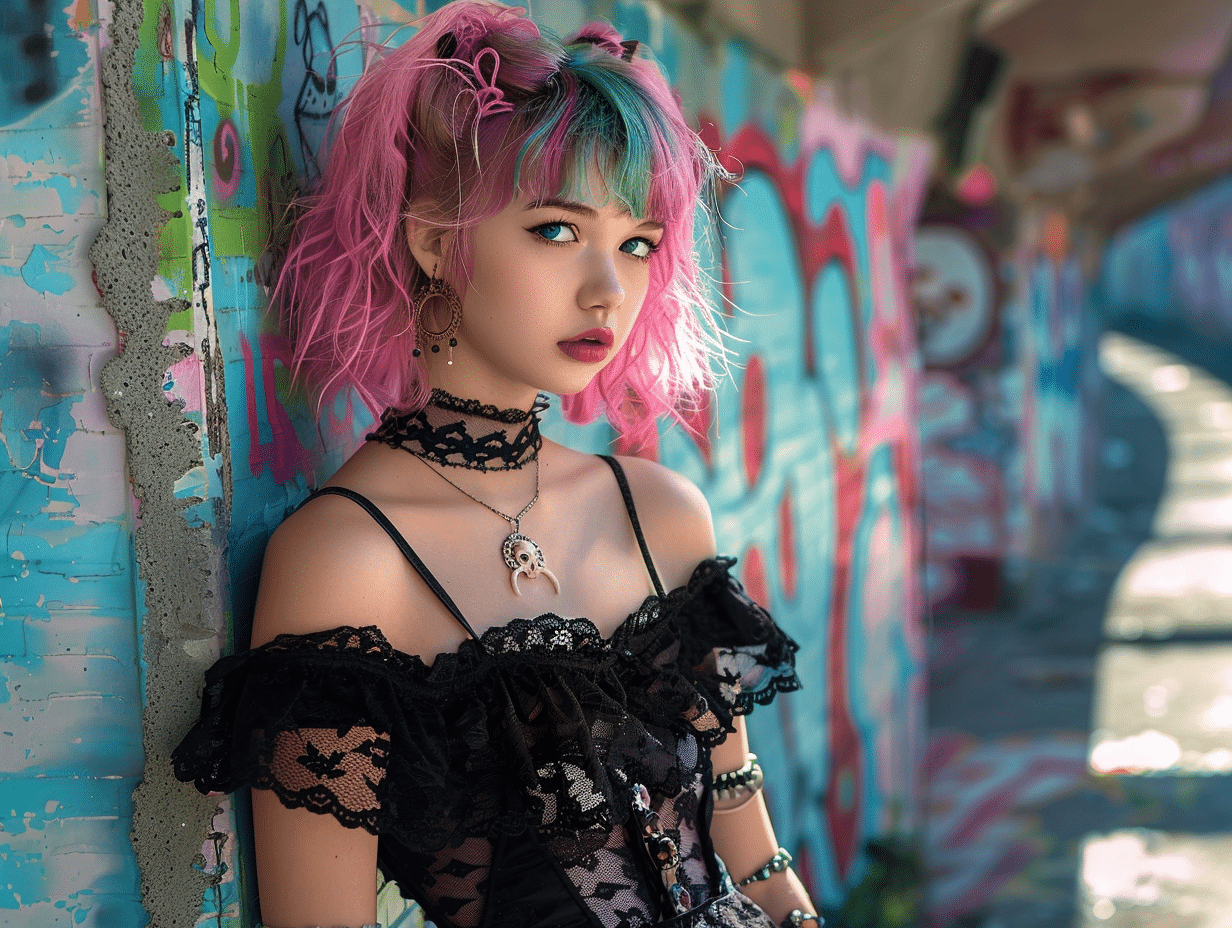 La culture gothique, mouvement culturel ayant émergé au Royaume-Uni dans les années 1980, est caractérisée par une rébellion esthétique contre les normes établies. Lorsque ces codes de rébellion rencontrent l’innocence et la douceur enfantine du style kawaii, le pastel goth émerge comme une esthétique unique et audacieuse. Des influences marquées par l’excentricité débridée du District de Harajuku à Tokyo, épicentre de la mode avant-gardiste, s’entremêlent pour donner naissance à cette tendance qui défie les catégorisations simplistes.