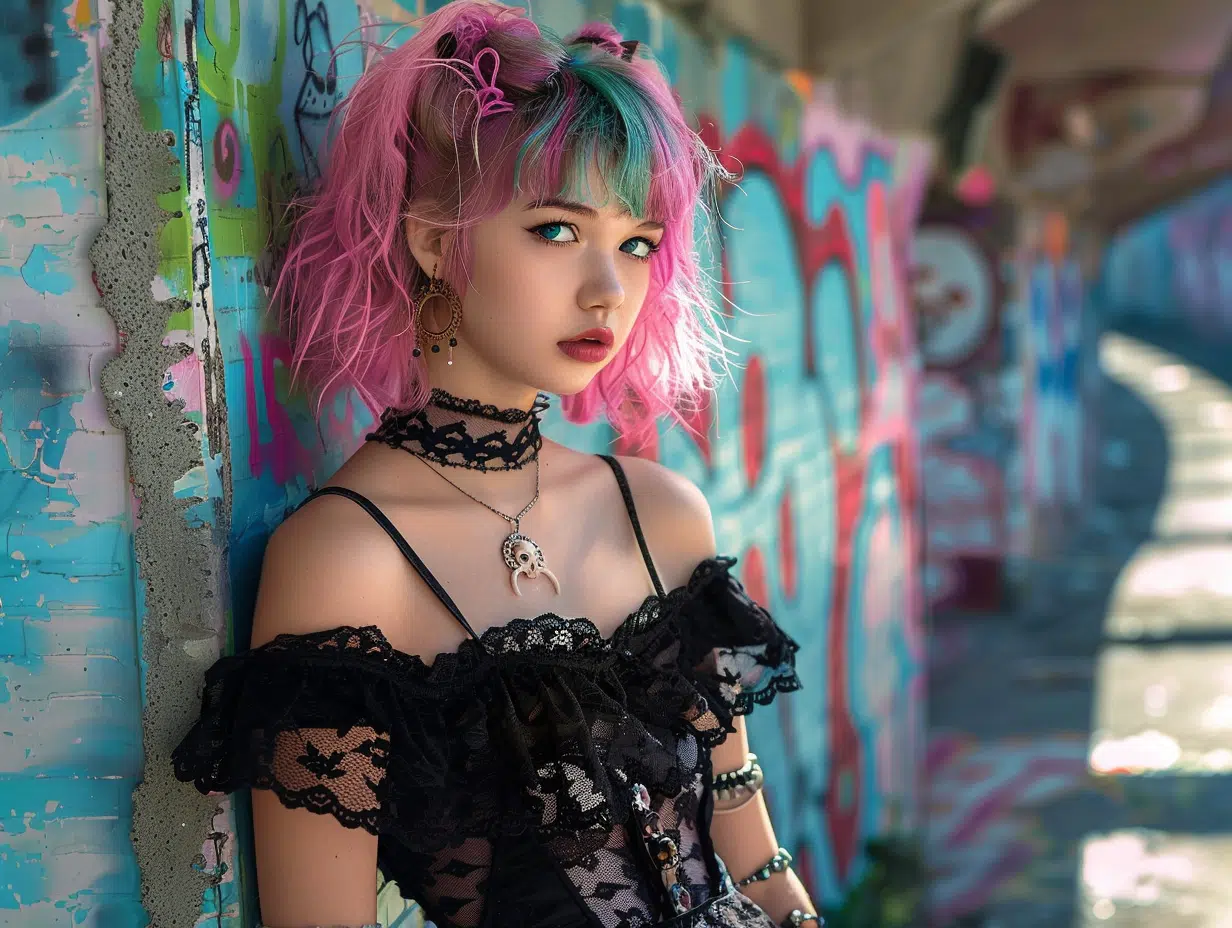 Le style Pastel Goth, courant de mode à la croisée des chemins, trouve ses racines dans le terreau fertile de la culture kawaii japonaise et l’esthétique sombre de la culture gothique. Né dans le sillage des Ulzzangs coréens, réputés pour leur perfectionnisme et leur soin du détail, et des Himegyarus japonais, incarnation de la sophistication, il incarne une forme d’expression personnelle qui transcende les frontières traditionnelles de la mode. Ce courant s’est imposé comme une tendance mode gothique colorée et originale, où les nuances sucrées des bonbons se mêlent à la noirceur gothique pour créer un contraste visuel saisissant.